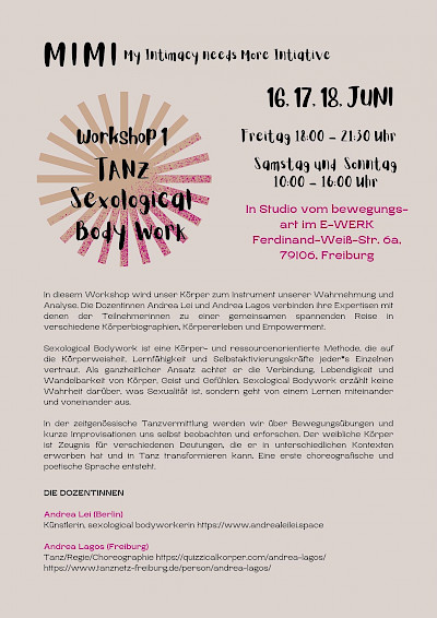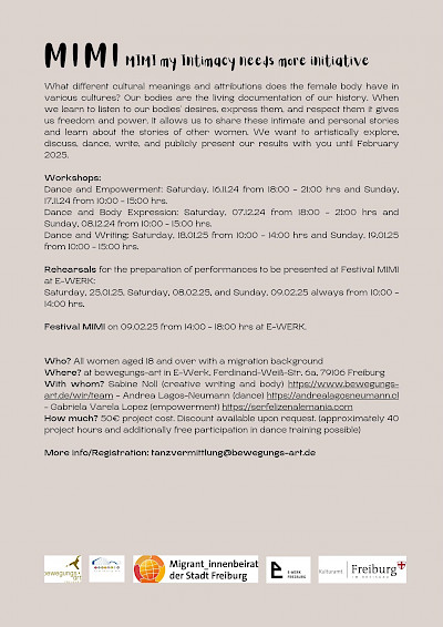 Als langjähriger ansässiger Partner des E-WERKS übernimmt bewegungs-art e.V. die Expertise und Mitverantwortung für das Projekt in Form von Angeboten und gemeinsamen Formateentwicklungen mit den Bewohner:innen und der Nachbarschaft im Bereich zeitgenössischer Tanz/Community Dance ab September 2026.
